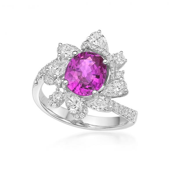 This exquisite 2.05ct pink sapphire ring, adorned with pear-shaped diamonds, showcases unparalleled brilliance.