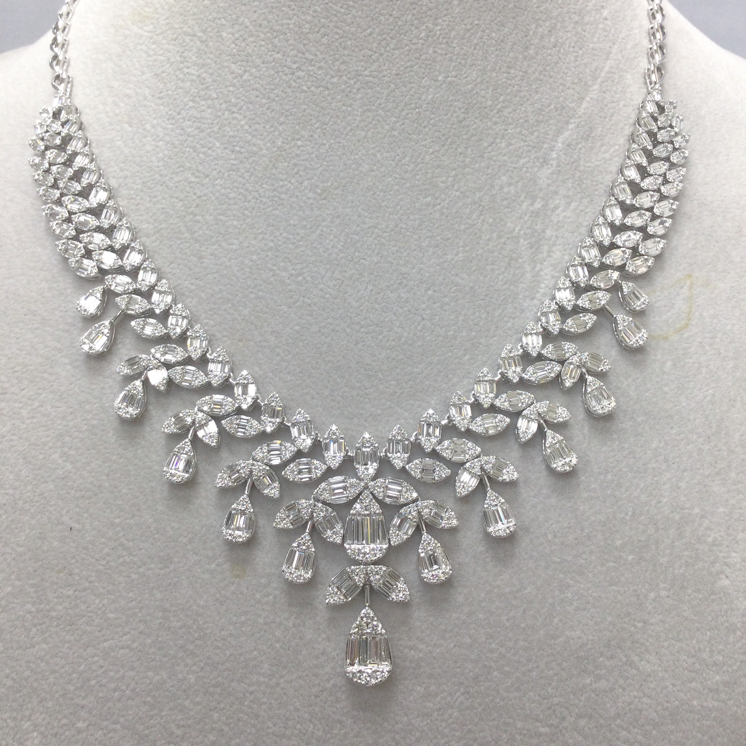 This is an elegant 18k gold necklace designed with a combination of round and baugette diamonds.