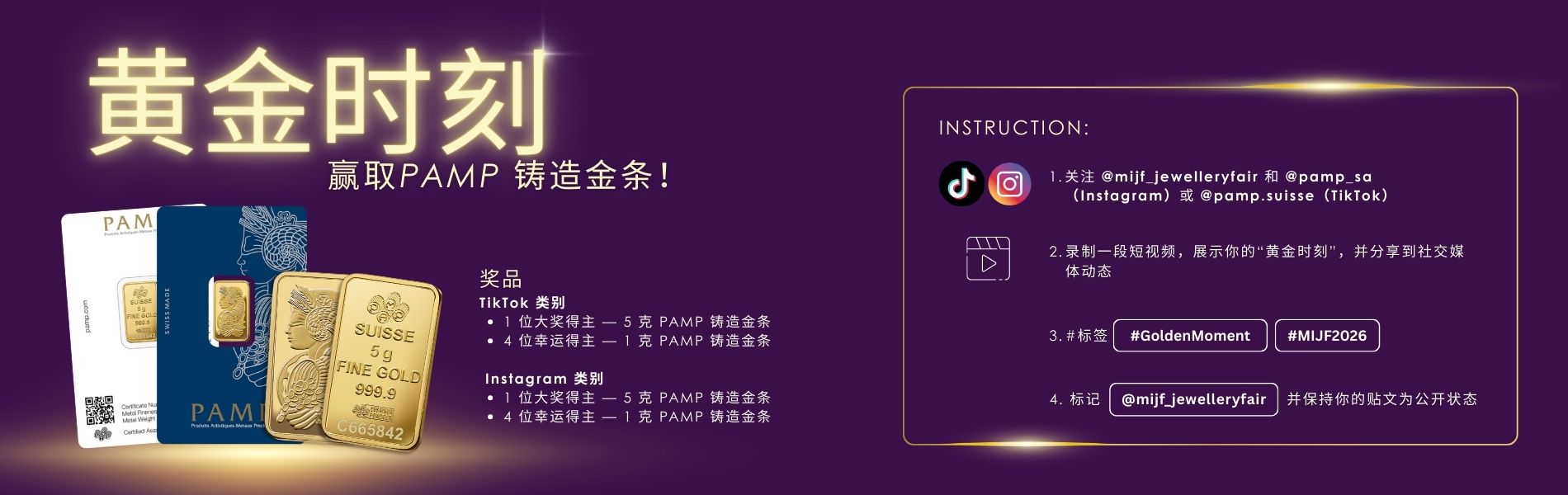 1. 关注 @mijf_jewelleryfair 和 @pamp_sa(Instagram)或 @pamp.suisse(TikTok)。
