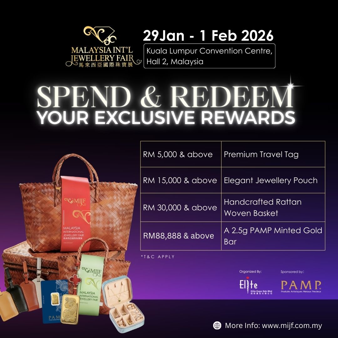 – Grand Prize: Spend RM 88,888 & above – Redeem a 2.5g PAMP Minted Gold Bar
